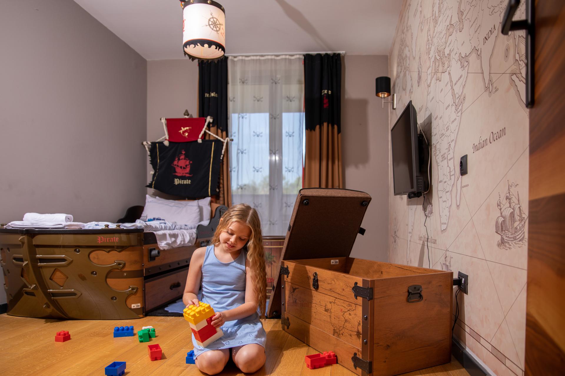 U sklopu prostranog apartmana pored sobe za odrasle, nalazi se i fizički odvojena, posebno dizajnirana, dečija soba. Tematika pirata i kreativno okruženje podstaknuće maštu vaših mališana da se otisnu na otvoreno more u potragu za blagom. Kroz igru i mapu sveta naučiće više o putevima moreplovaca i tajnama okeana. Učinite odmor vaših najmlađih nezaboravnim i punim avantura.